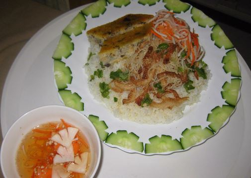 - Xới cơm ra đĩa, rưới boa-rô phi dầu lên, bày sườn một bên, đồ chua một bên, thêm chút ngò. Dùng với nước tương pha chanh ớt đường kiệu.
