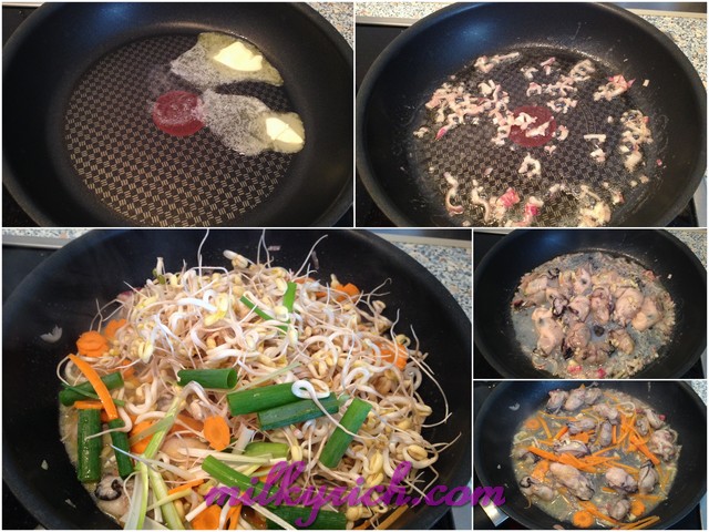 - Khi hành và tỏi đã dậy mùi thơm thì chúng ta tiến hành cho thịt hàu vào xào với lửa to, đảo vài lần để cho hàu săn lại rồi cho tiếp cà rốt vào đảo đều khoảng 1 phút, nêm nếm thêm gia vị.