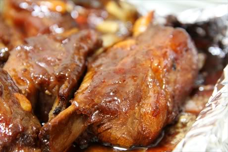 - Nướng sườn: Các bạn chuẩn bị khay nướng lót giấy bạc, xếp sườn vào khay. Hoà bát nước hầm sườn nếu thấy nhiều mỡ nổi lên thì gạn bớt mỡ đi với ½ sốt đã nấu rồi rưới đều lên sườn, lật cho sườn ngấm đều sốt, hành tây rắc đều lên rồi phủ kín giấy bạc trên mặt. Nướng ở nhiệt độ 200 độ trong khoảng 60 phút cho đến khi sườn ngấm đều sốt và nước sốt sền sệt. Khi nướng các bạn nên lật sườn 2-3 lần cho sườn ngấm đều sốt. Khi gần hết thời gian nướng, bỏ giấy bạc đậy bên trên cho miếng sườn xém vàng có màu đẹp.