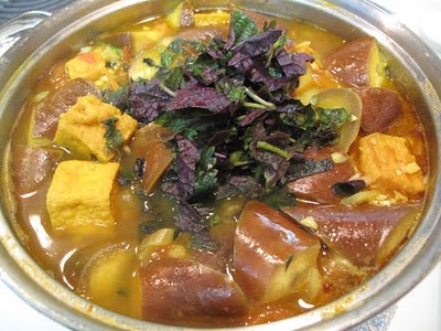 - Bây giờ, các bạn cho cà tím, đậu phụrán và thịt vào nồi. Nêm một ít nước mắm, muối, hạt nêm cho vừa ăn và đun lửa nhỏ cho các nguyên liệu ngấm đều gia vị.