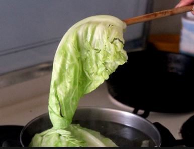 - Bắp cải tách ra từng lá, bỏ cọng cứng, rửa sạch, nấu nước sôi pha chút muối trụng sơ, bắp cải hơi mềm mới dễ gói.