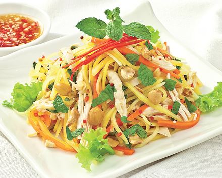 - Trộn chung đu đủ, đậu hủ, cà chua, đậu phông, kiệu, ớt, nêm chanh đường bột ngọt nước tương, trộn đều cho thấm, rồi cho phù chúc rau răm vào sau, dọn ăn kèm với bánh tráng.