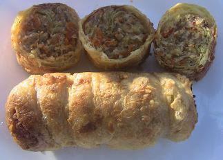 - Múc vào bao nylon, xe thành từng dây dài nhưcây lạp xưởng, đặt lên bánh tráng đã thoa nước củ dền, cuộn tròn lại, cột dây ở 2 đầu.