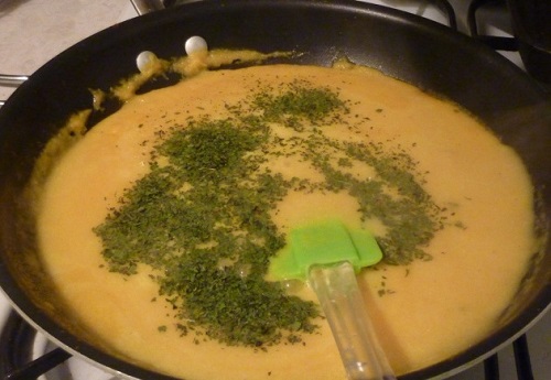 Bánh mì thái hạt lựu, rán vàng giòn. Khi ăn rắc tiêu, bánh mì lên trên, ăn nóng.