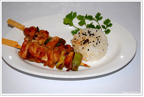 Cho thịt gà ra tô, ướp tiếp với tỏi tây, hành khô, tỏi, ớt hiểm, ớt chuông, dừa nạo, nước cốt dừa, nước tương, dầu ăn khoảng 30 phút. Xiên những miếng gà vào xiên tre, nướng trên than hoa chín vàng.